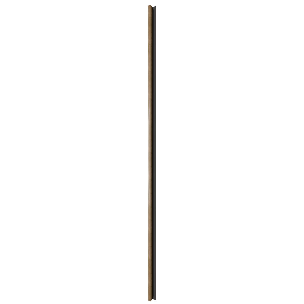Dubová lamela na černém podkladu o rozměru 2750 x 64 x 40 mm, která se hodí do moderních interiéru. Lamela je vyrobena z MDF, která je potažená PVC fólií a připevněna k HDF desce o tloušťce 3 mm.